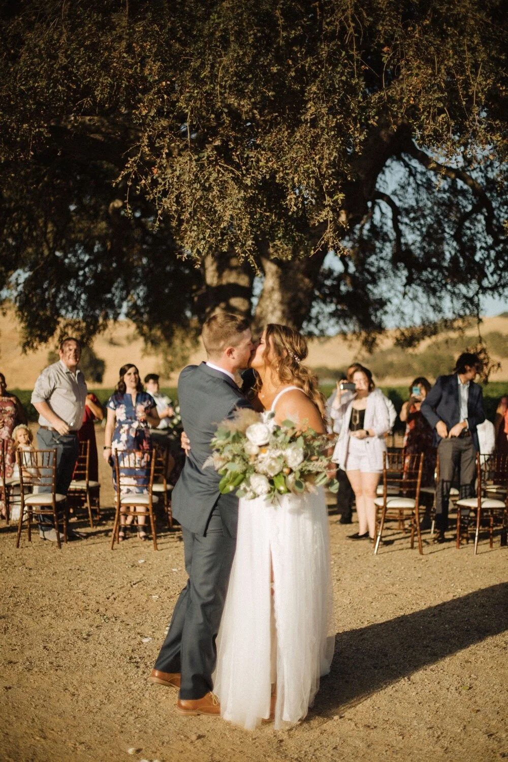 Guests arriving Cass Winery were greeted by a welcome toast before heading over to the ceremony site, a giant oak tree in the middle of the vineyard. Rows of vines made for a picturesque aisle for Lexa & Jordan’s good friend-turned-officiant, maid of honor, and best woman to make their way to the ceremony. Lexa and her father pulled up in the Cass Cab and made their way down the aisle as the sun began to set behind them. Lexa & Jordan designed a ceremony that truly celebrated their ten years of life together: all their ups and downs, college, building careers, buying a house, and even adopting their two fur babies. Everyone who was unable to travel to the Paso Robles wedding joined in via live stream and cheered on as the two finally became one.